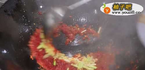 44、锅内留少许底油,放入姜丝、泡辣椒丝编炒一下,再放入豆瓣酱煸炒几下。
