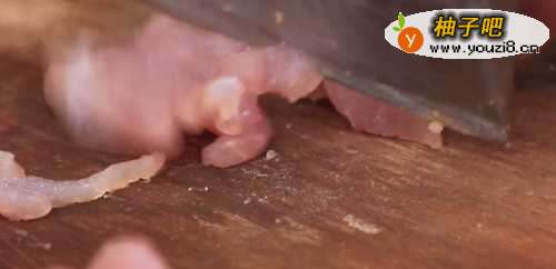 1、把腿肉批切成火柴梗粗的肉丝,加黄酒、鸡蛋清、盐、味精、胡椒粉、淀粉,拌匀上味上浆。