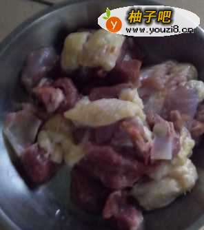 把鹅肉洗干净,切成均匀大小的块状。在市场买鹅肉时,注意看一下鹅肉的颜色、鹅皮低下的脂肪,尽量选购鹅肉颜色新鲜,鹅皮低下脂肪较少的鹅肉,这样的鹅肉不会太油腻。