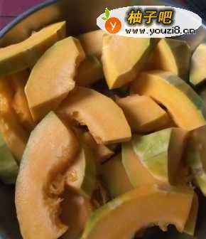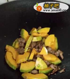 5放入南瓜。鹅肉焖了3-5分钟之后,已基本熟了,但鹅肉本身比较韧,需要多焖一下,因此,鹅肉焖了3-5分钟后,再放入南瓜,盖上锅盖焖3分钟,如果锅中的水份不够,可以加入一些开水,以防南瓜在焖的过程中,因缺水而粘锅。