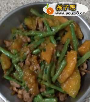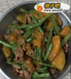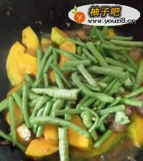 6放入豆角。在鹅肉和南瓜焖的差不多熟的时候,再放入豆角,大火翻炒,期间可以再放入一些酱油调味。豆角炒熟后,关小火,放入一些盐,再炒均匀即可。