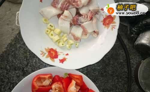 将五花肉切片,蒜头去膜切碎,红椒洗净切小块;