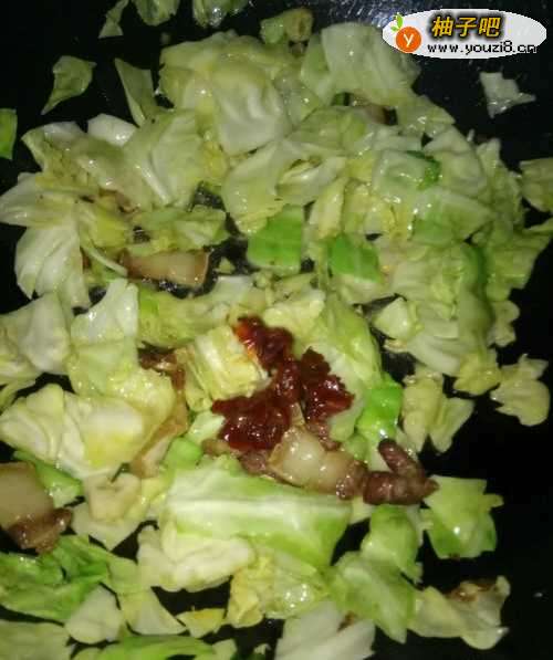 4将牛心菜下入锅里翻炒几下,舀一勺豆瓣酱下入锅里;