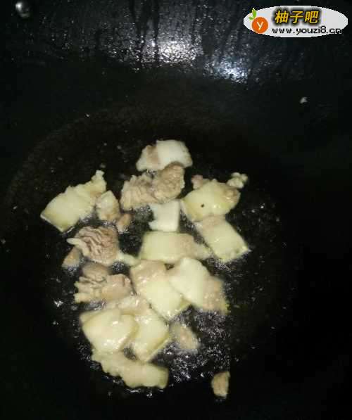 3开火,加入少量油,将五花肉下锅里煎一下;