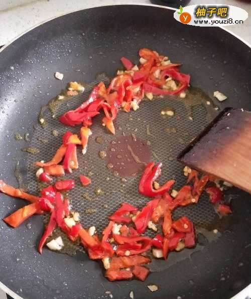 5等锅中的油烧开后 加入蒜、辣椒,炒出香味后再加入之前炒好的小肉块。