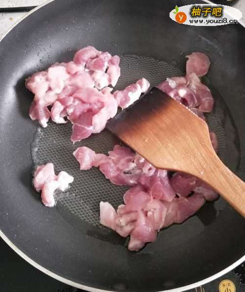 4在锅中加入油,等油沸腾后加入切好的肉,不断的翻炒。要注意把肉中的水分炒干,或者直接滤去多余的水。然后盛出装盘。