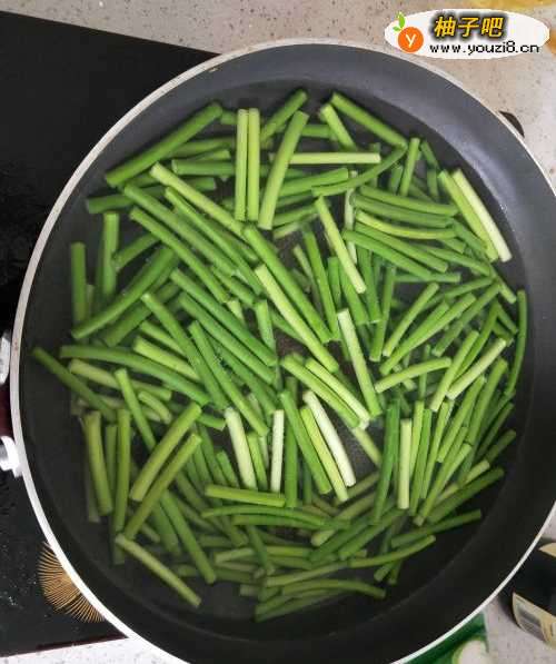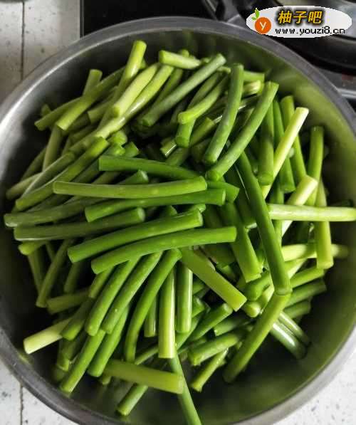 3等蒜苗切好后,直接把蒜苗加入煮沸的开水中。煮一段时间后捞出,放入盆中。(注意:不能煮太久,容易让蒜苗里面太多水分。也不能不煮,很容易让炒出来的蒜苗不熟。)
