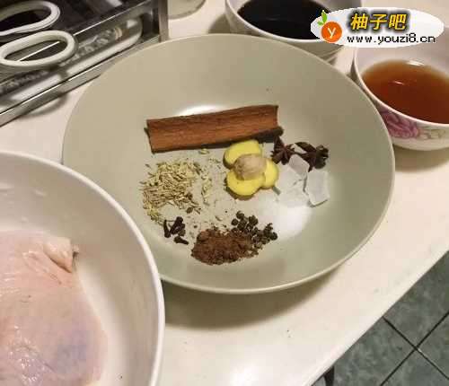 2接着锅中加入水,酱油,黄酒,丁香,肉桂,姜片,茴香,大料,花椒,冰糖,红糖,盐,煮沸,冷却后将鸭腿入冷藏腌制一夜。