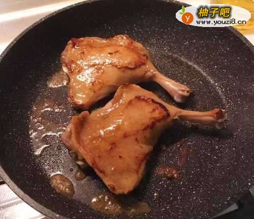 3第二天将腌好的鸭腿取出来,开火,锅烧热之后平底锅不放油两面各煎一分钟,煎至表皮稍微焦黄即可。