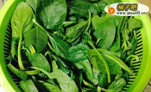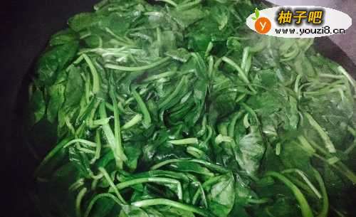 2接着锅里放冷水,水烧开之后把洗干净的菠菜倒进去焯水,去去菠菜的草酸!焯水时间不宜过长,30秒即可捞起来!