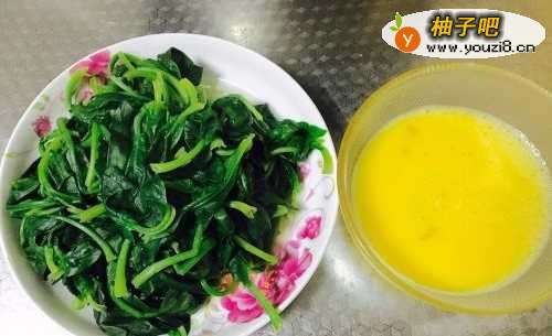 3然后把鸡蛋打散,焯好水的菠菜放在盘子里备用。