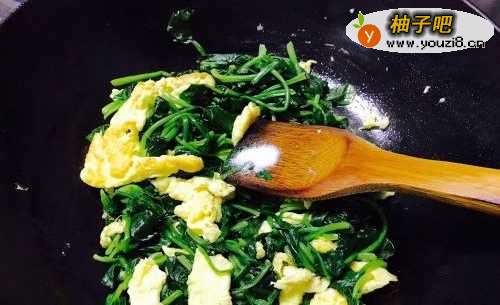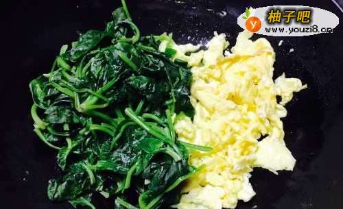 6待菠菜和鸡蛋翻炒均匀之后即可加入少量盐调味出锅贪汽。因为菠菜刚刚已经焯水一遍了,基本已经董仗熟了,所以不宜烹煮时间过长!