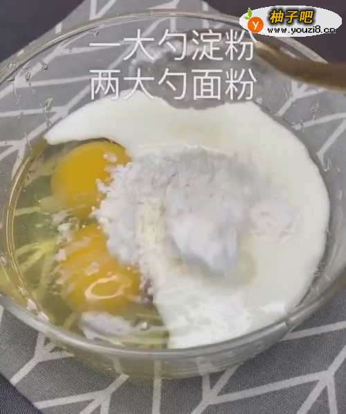 2然后加上两勺白砂糖,一大勺淀粉,2大勺面粉