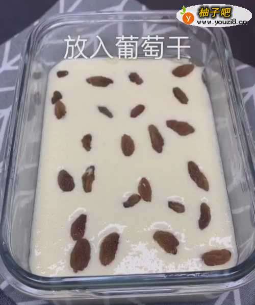 5在表面放上葡萄干,再盖上保鲜膜,然后用牙签在保鲜膜上扎孔