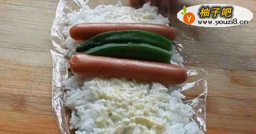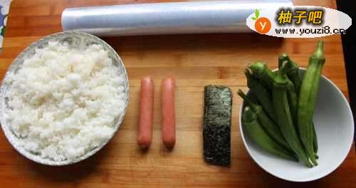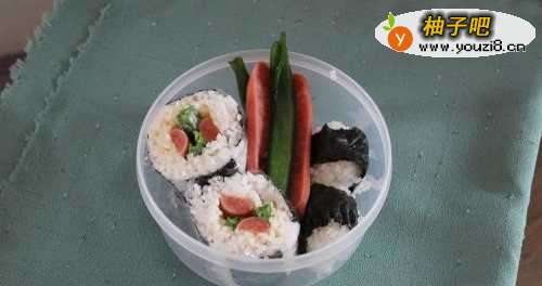 8将卷有秋葵和香肠的切开,最后把所有饭团和剩下的食材放到饭盒里就可以了。