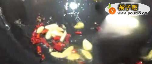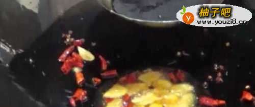 7另起锅油热下入生姜,蒜片爆香,再倒入花椒 干辣椒,翻炒一下
