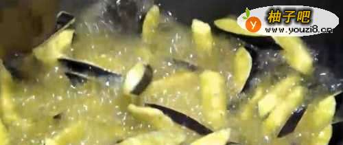 5锅内油温升高至7成热 下入茄子,不停地翻动,把茄子炸至表面金黄,大概一分钟即可捞出