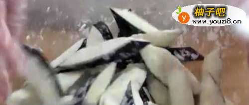 6油温升高至八成热 下入茄子复炸30秒,这样吃起来口感才会更加的脆,捞出控油