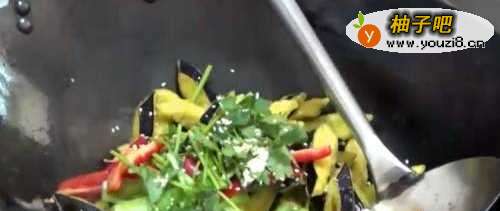 10下入炸好的茄子 青红椒 香菜 白芝麻