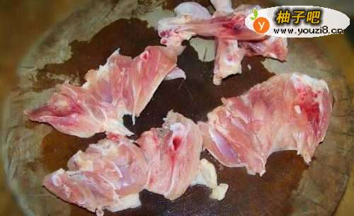 鸡腿肉剔下待用,将绍酒、少许盐、少许生抽加入鸡腿肉中,搅拌均匀腌制15分钟