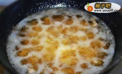 3坐锅起油,油温六成热下腌制好的鸡腿肉,油温升至八成热,将鸡腿肉炸至表面金黄,捞出沥油待用