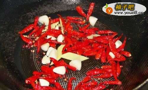 4另起锅,热锅冷油下生姜片、蒜子爆香,加入干辣椒、花椒爆香(随后放豆瓣酱和豆豉爆香,炒出红油)