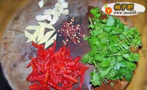 2生姜切块,蒜子切粒,干辣椒、花椒洗净晾干,香菜切小段待用
