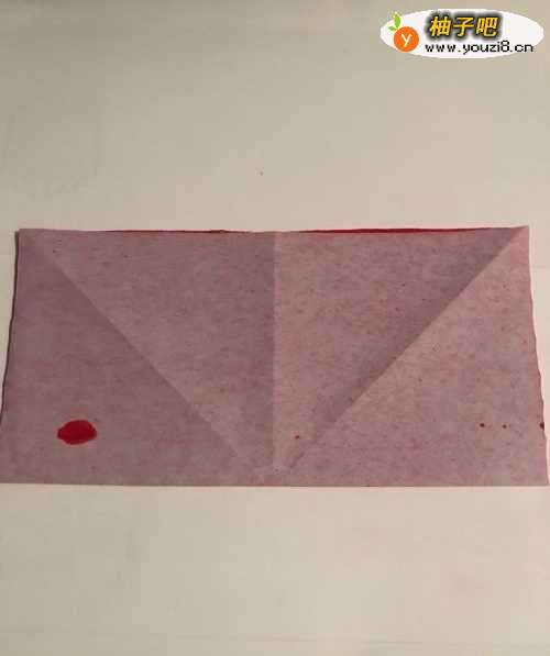 第一步 取一张16厘米X16厘米的正方形红色彩纸 把它折出两条对角线 然后再折出两条对边线