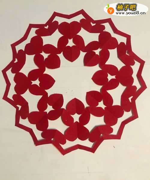 7第七步 剪完多余的彩纸之后 再剪里面的细节部分和镂空部位 还有其它涂实的部分 全部都剪完之后 把它展开铺平 一副漂亮的32颗爱心团花图案就剪完了