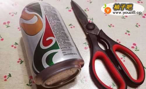 用剪刀将易拉罐从上部三分之一处扎破,沿着刀口剪一圈,将易拉罐分为上下两部分,用剪刀修一下刀口的毛刺,以免扎伤手。