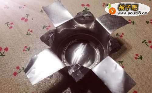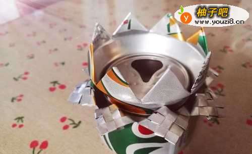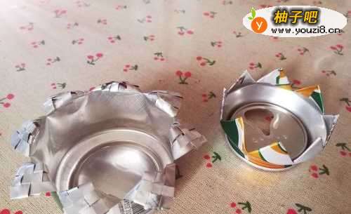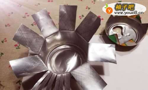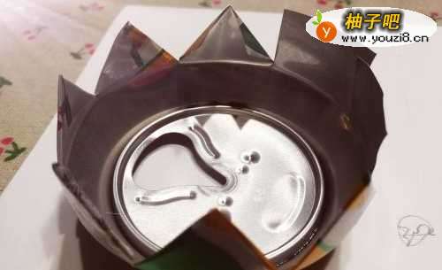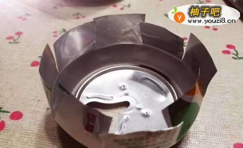 2带罐口的上半部分,用剪刀垂直罐沿剪出对称、等距的8个切口,切口长度约1.5厘米。