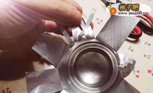 5将左边3小条与右边3小条交叉编织,左边的向右折,右边的向左折,拉紧后将外侧的铝条向背面折进去,做成呈三角形的花瓣状,