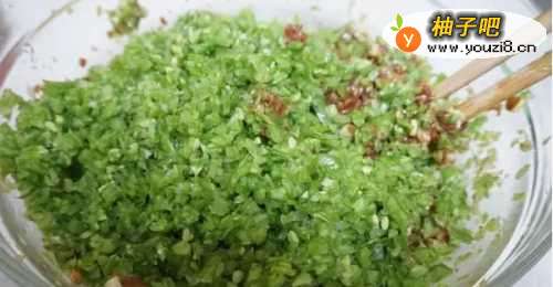 33、攥干的豆角放入肉馅里,可以打一个鸡蛋或者倒入1小勺食用油,这样搅拌的时候容易上劲。