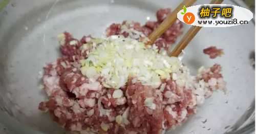 22、准备适量肉馅,加入葱姜末。接着加入各类调味料拌匀。
