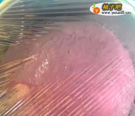 3紫薯泥中加少许清水,倒入5g酵母粉搅拌均匀,再加入面粉,搅拌成浓稠状;