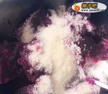 2上锅蒸熟后放入白糖,用勺子压成泥;