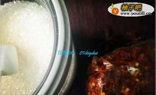 5准备少许白砂糖、辣椒末、八角、桂皮,锅清洗干净,重新加入适量油,放入白砂糖、辣椒末、八角、桂皮,将其炒香。