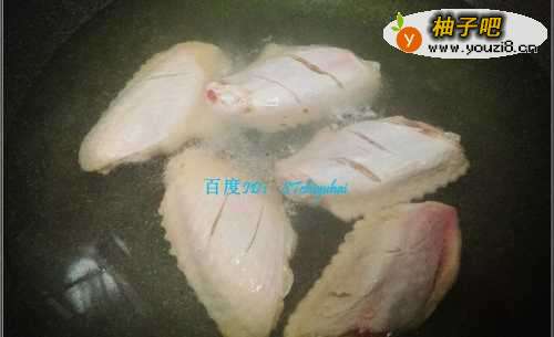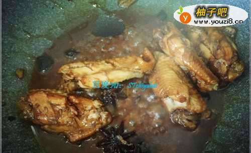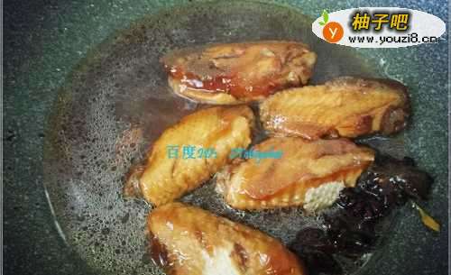 6倒入高压锅炖过的鸡翅中,加入红烧酱油、盐、料酒、醋等,加入适量水,先大火将其烧开。