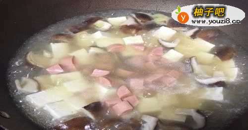 5倒入之前备好的豆腐块、火腿肠丁