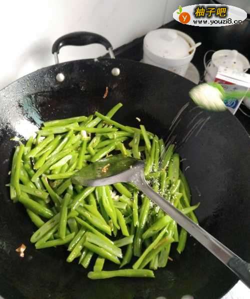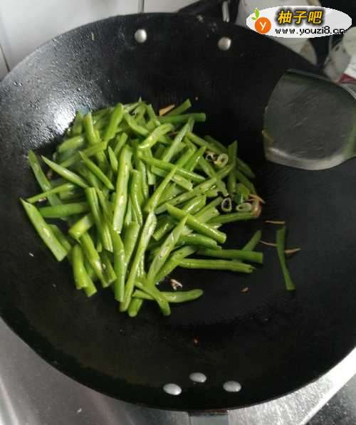 6第六步,倒入切好的青豆角在锅中翻炒。