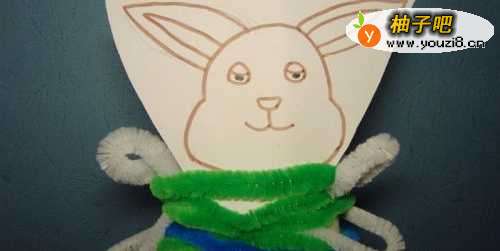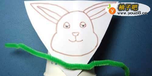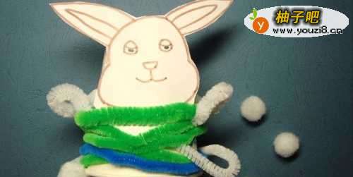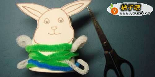 然后,取两根白色毛根缠绕在纸杯上,弯曲的一段作为兔子的手和脚,如下图所示。