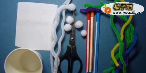 制作纸杯兔子的材料和工具,有一个纸杯、白色和绿色的毛根、 剪刀、卡纸、铅笔、彩色笔和绒球,如下图所示。