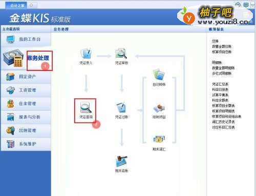2在功能选项菜单,单击【账务处理】-【凭证查询科扯】;始购颂
