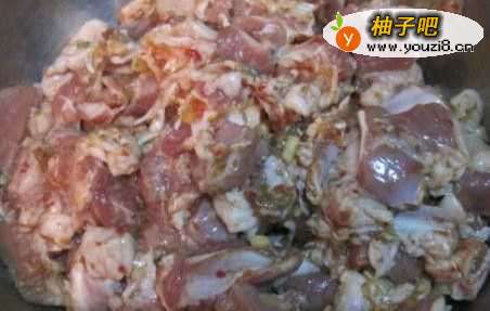 3最少腌制四个小时左右后,加入面粉再搅拌均匀,然后将准备好的竹签把羊肉颗粒串起来,看竹签的长度多串一些或少串一些