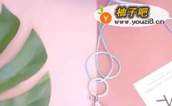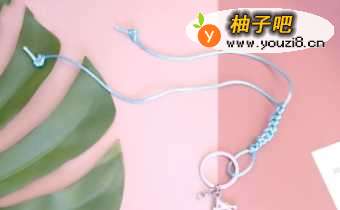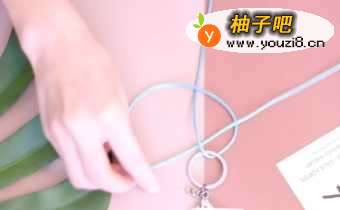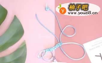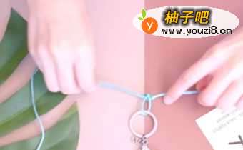 将绳子穿过钥匙扣,绳子对折使钥匙扣在绳子总长度一半的位置。