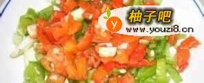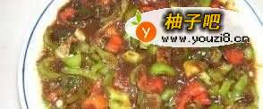 4将调好的酱倒入青红椒中拌匀。