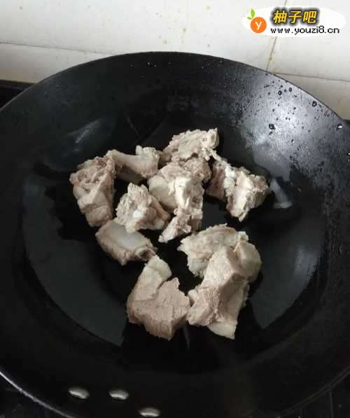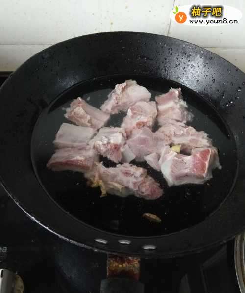 把排骨洗干净后,放入锅中,锅中加入适量的水和几片姜片,大火煮开。目的是去除血沫和腥味。