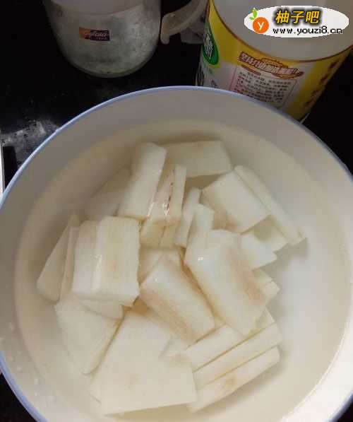 4山药去皮,洗干净,切成片,放入碗中加入清水,防止山药氧化变黑。