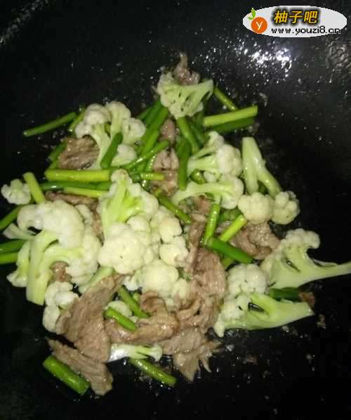 6再将花菜下入锅里,翻炒至熟,再加入盐和味精,调味好,就行了。