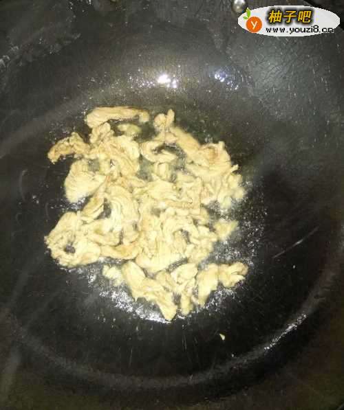 4开火,加入适量的食用油,将瘦肉下入锅里炒熟、炒至肉变白色;